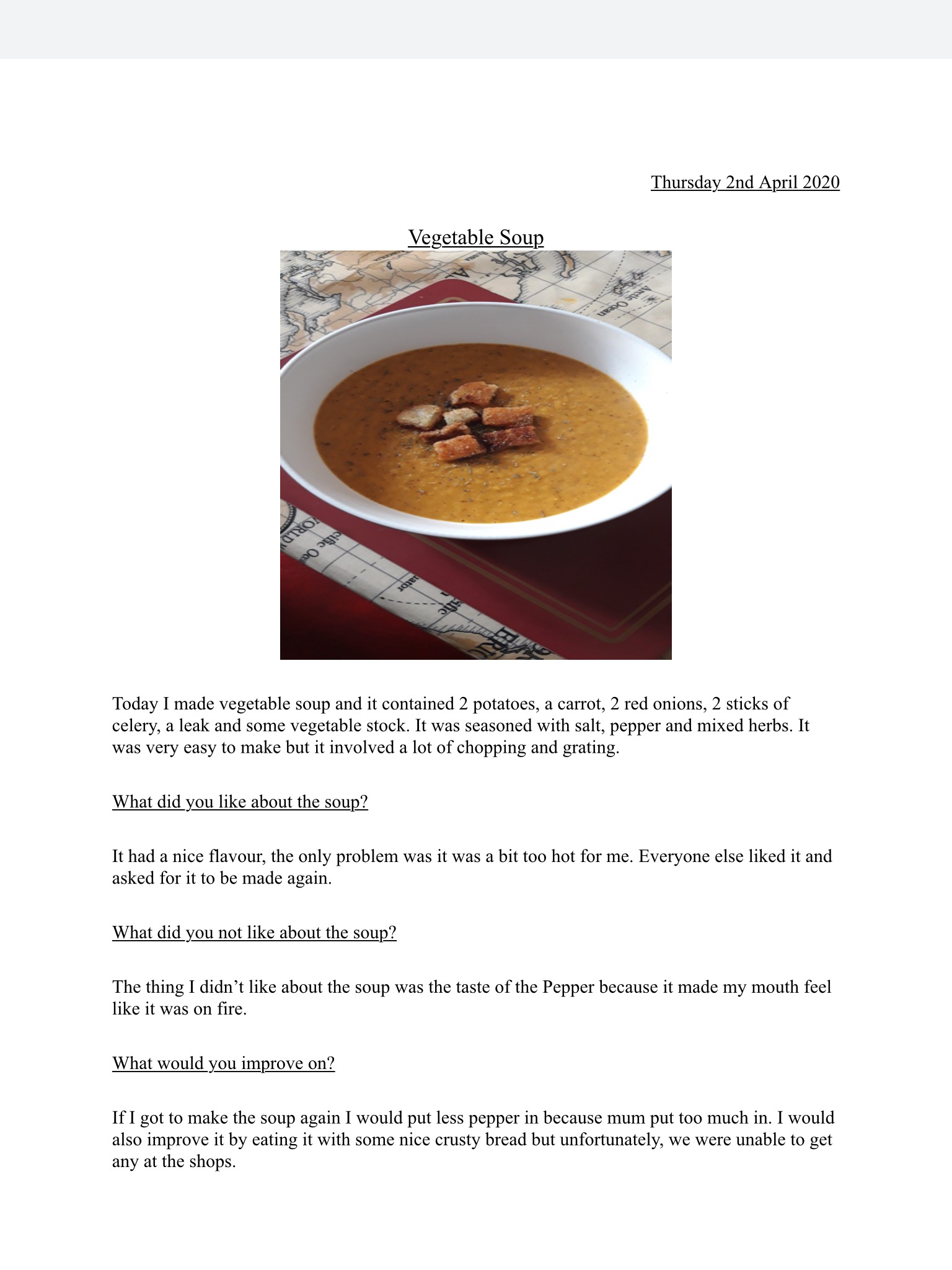 Chef Gina made a Vegetable soup 👩🏼🍳 April 3, 2020Uncategorizedwoodmanseyprimary1856 Wow Gina, that looks delicious!
