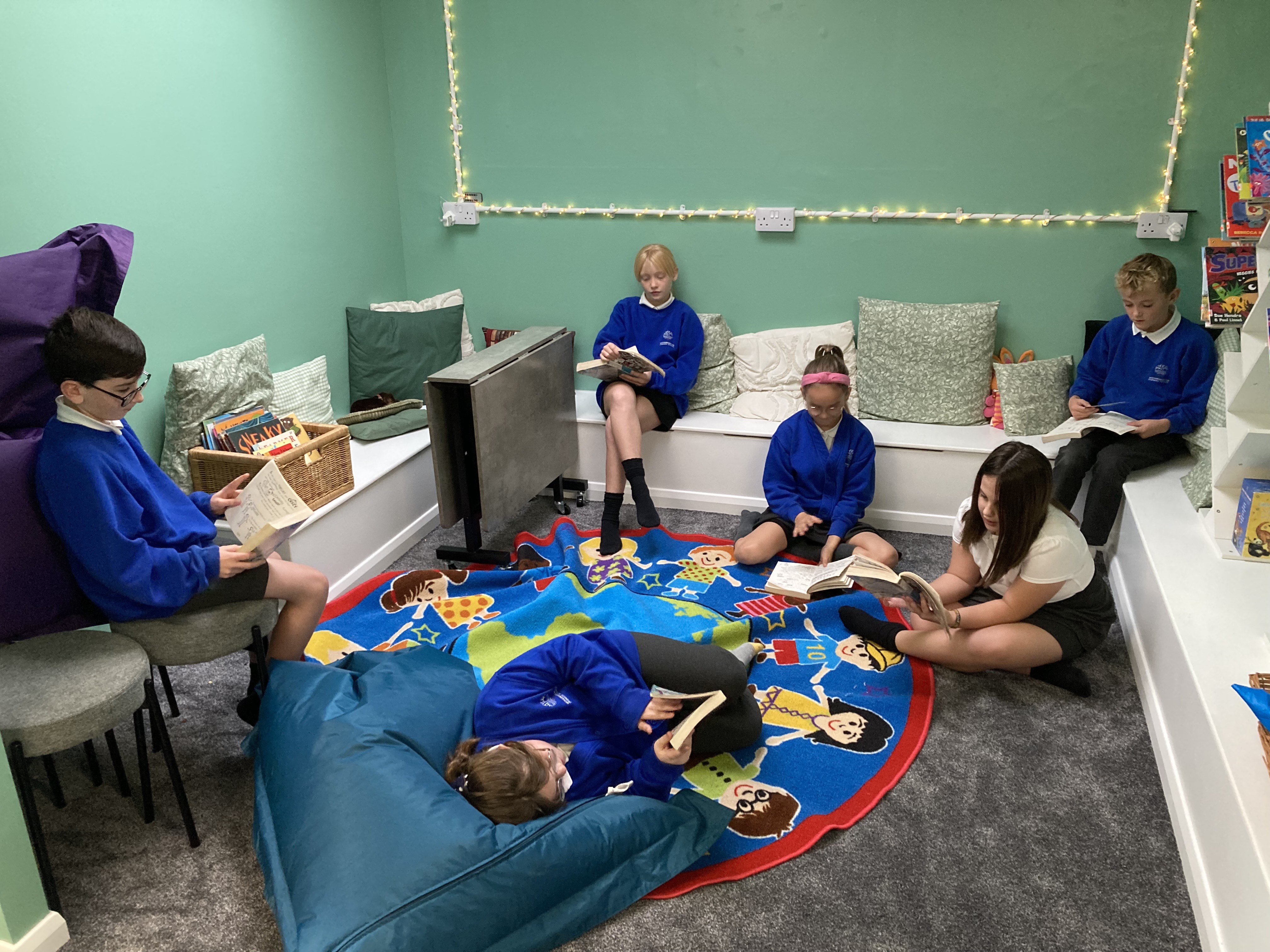 Y5/6 children are enjoying Guided Reading in The Nook this morning.